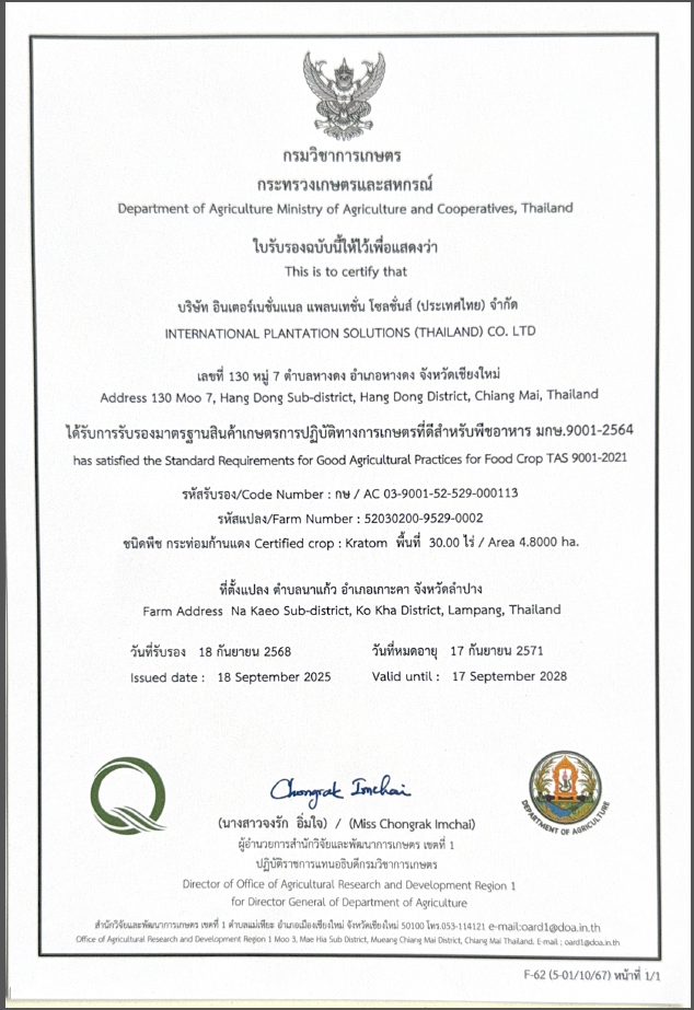 We are now delighted to confirm that International Plantations Solutions (Thailand) Co. received our Good Agricultural Practices (GAP) approval on Monday, 22nd September, for 30 rai (Phases 1 & 2 of our plantation).